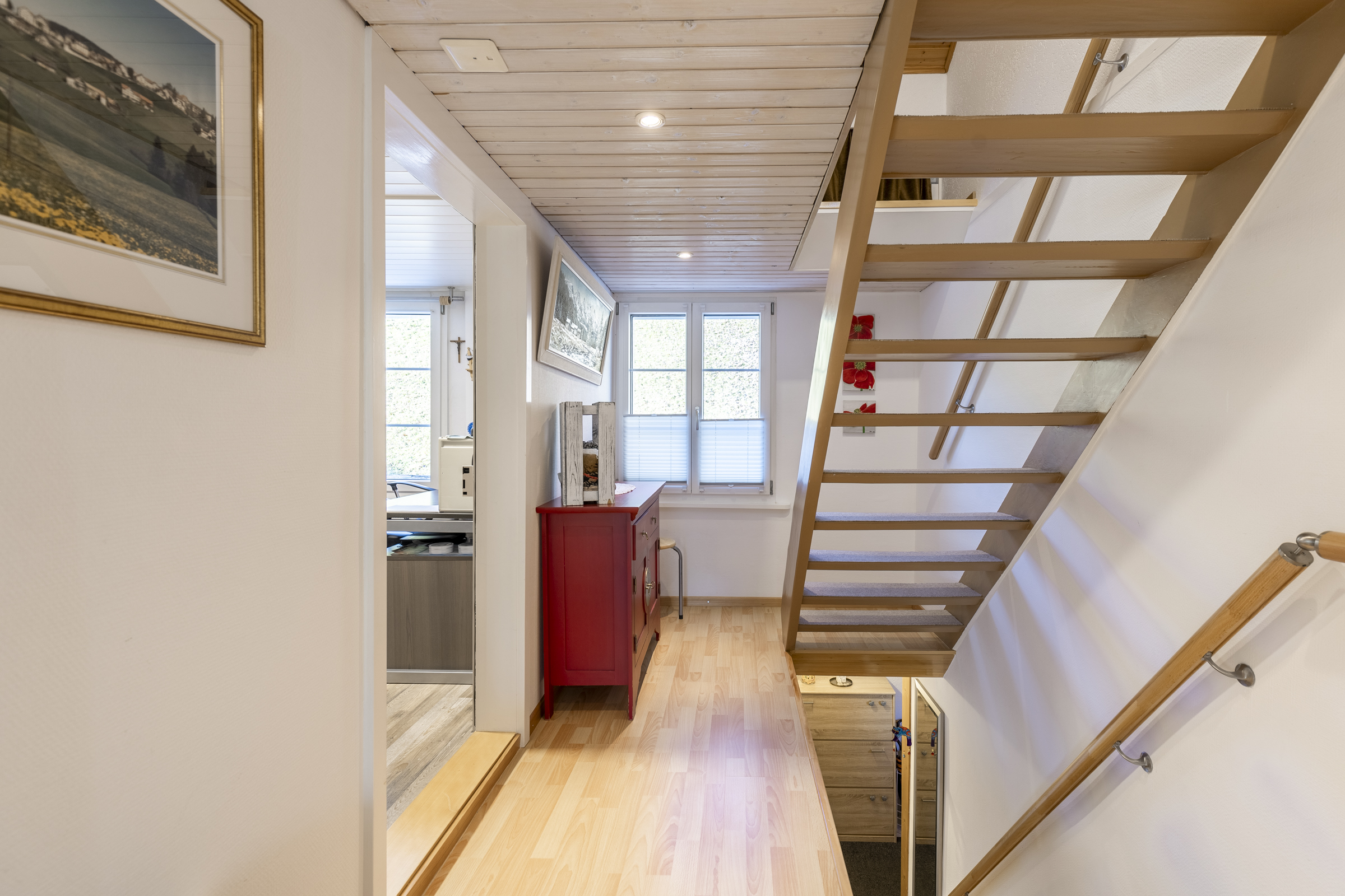 Im Erdgeschoss bildet das separate Esszimmer mit schönem Kachelofen zusammen mit der praktischen Küche das Herz des Hauses: ein Ort zum Geniessen und Zusammensein. Die Terrasse, die sich am Abend in der Sonne zeigt, erweitert den Wohnraum ins Freie und lädt zum Verweilen unter freiem Himmel ein. Ein einladender Eingangsbereich sowie ein Gäste-WC ergänzen das Erdgeschoss perfekt.