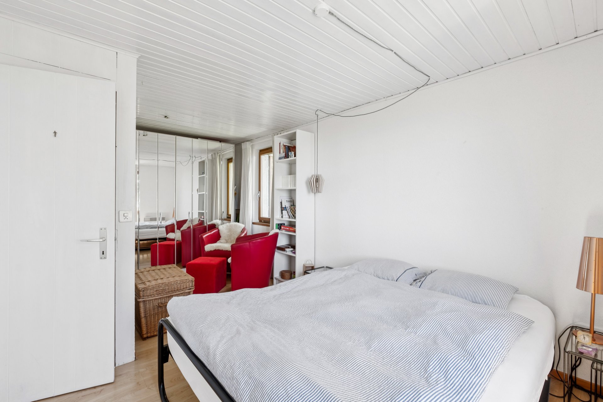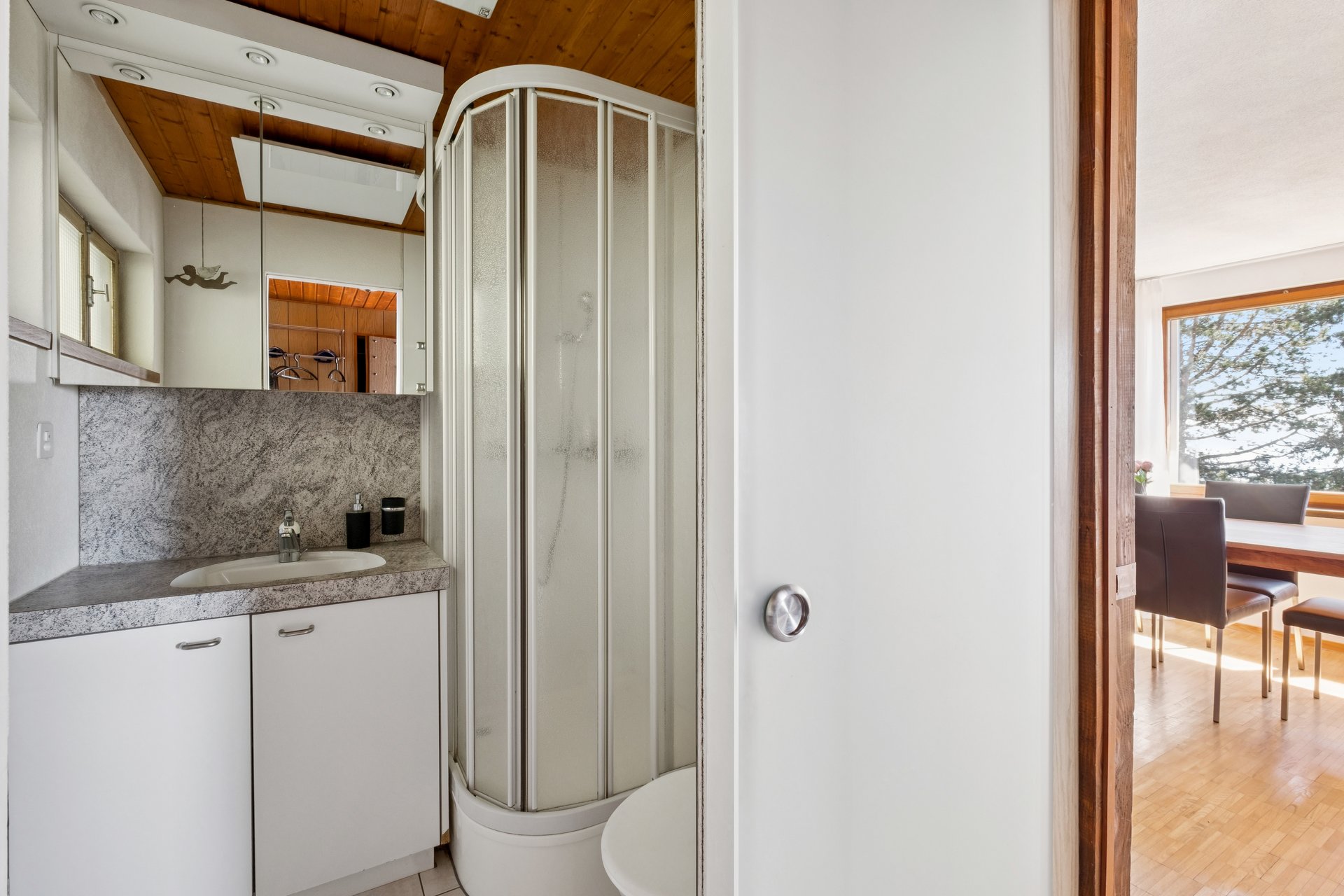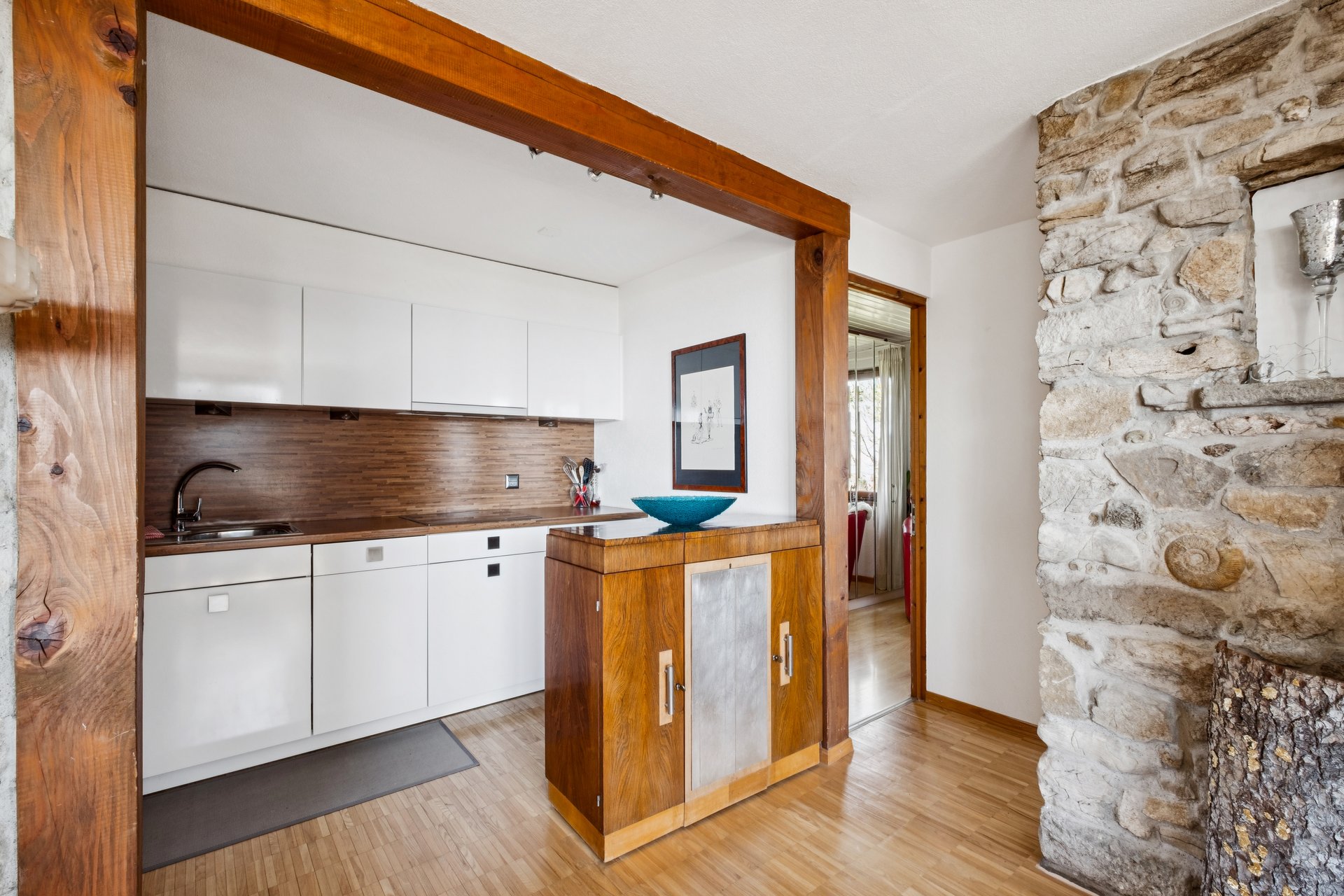 Die Liegenschaft verfügt über ein Entrée mit angrenzendem Badezimmer mit Dusche und begeistert mit dem aussichtsreichen Wohnzimmer, in dem das stilvolle Cheminée für gemütliche Stunden sorgt. Die angrenzende, funktionale offene Küche und ein Schlafzimmer sowie ein kleineres Zimmer ergänzen zusammen mit dem Reduit das Raumangebot.