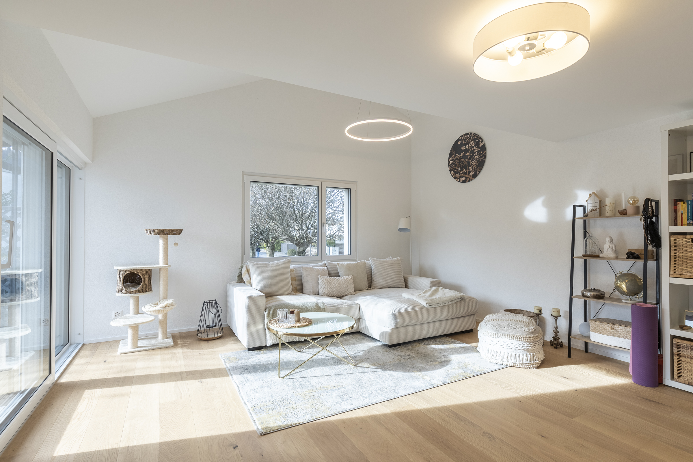 Die besondere Architektur überzeugt mit einem durchdachten Raumkonzept und optimalem Lichteinfall. Hochwertiger Parkettboden verleiht den Wohnräumen eine warme Atmosphäre. Im Erdgeschoss erwartet Sie ein einladendes Zimmer, das vielseitig genutzt werden kann.