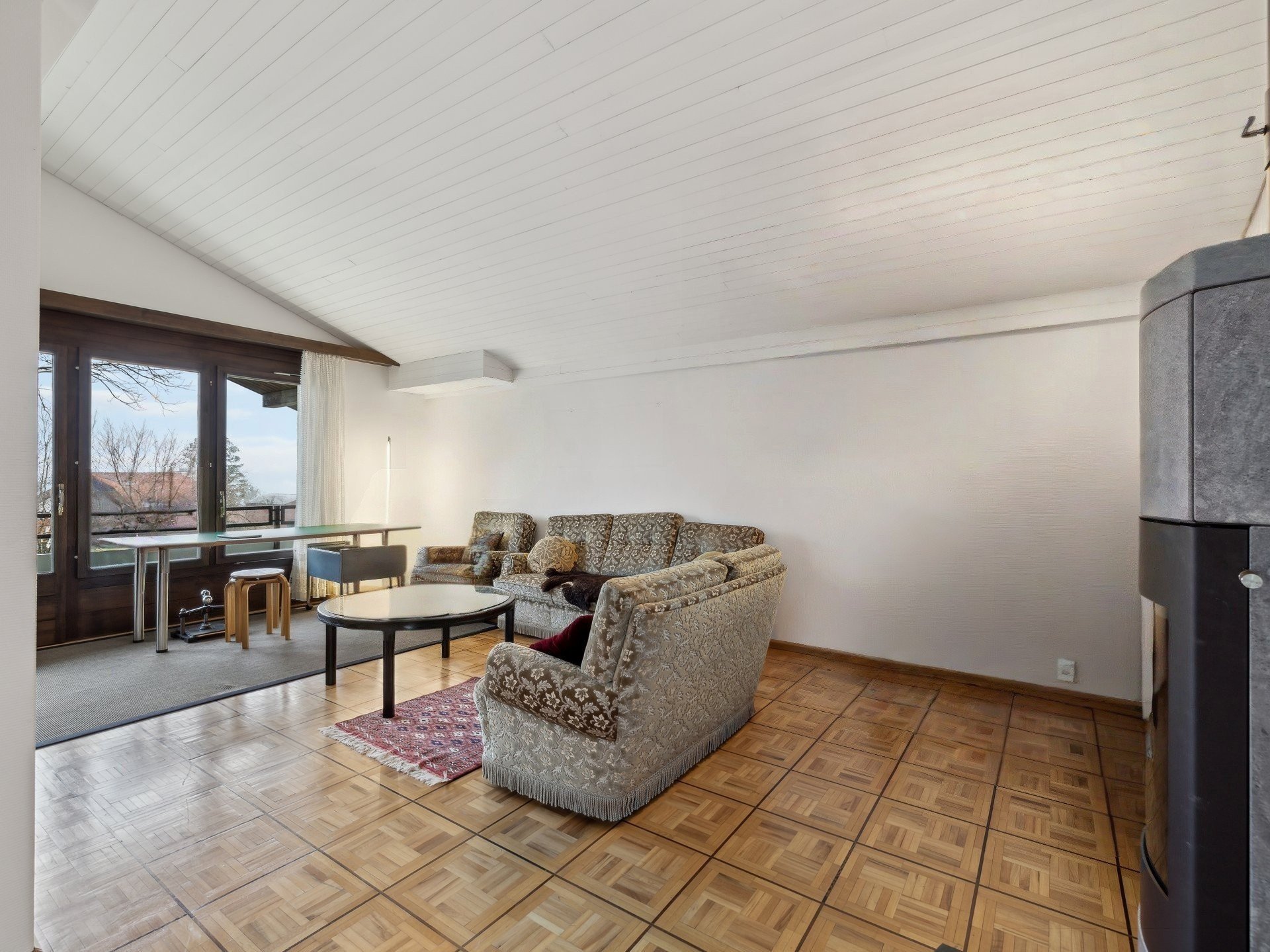 Das Obergeschoss umfasst drei Zimmer, die sich als Schlaf-, Arbeits- oder Gästezimmer eignen. Zwei der Räume verfügen über einen direkten Zugang zum Balkon. Ein Schwedenofen sorgt in einem der Zimmer für zusätzliche Wärme. Das Familienbad mit Tageslicht rundet das Obergeschoss funktional ab.
