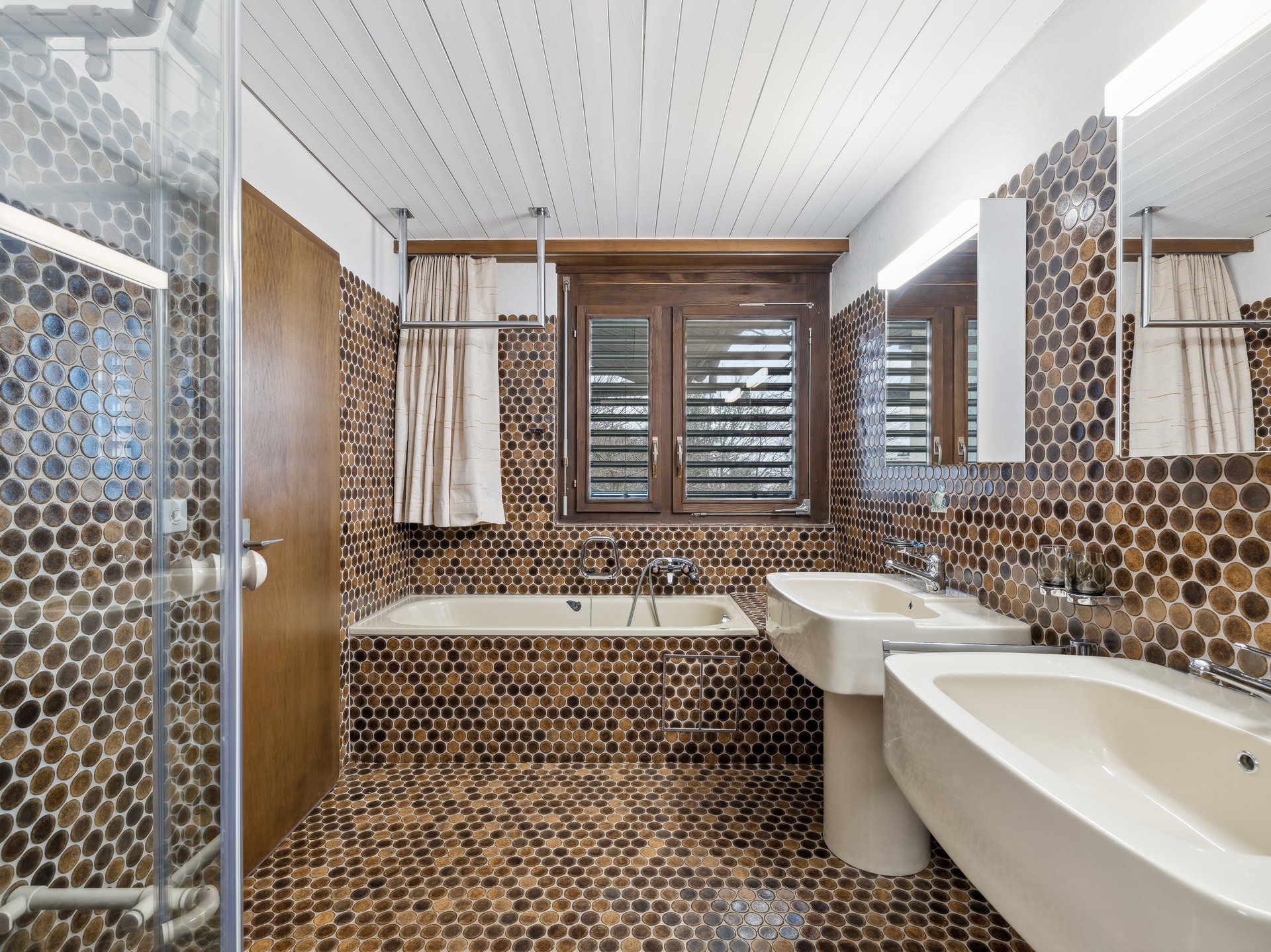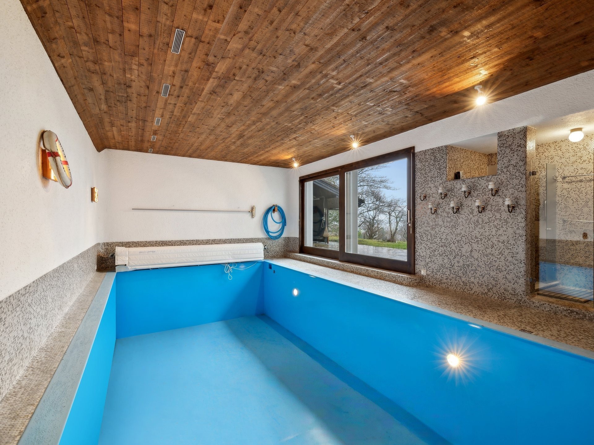 Im Erdgeschoss befinden sich nebst Gäste-WC und Hauswirtschaftsraum eine offene Küche mit angrenzendem Essbereich sowie ein Wohnraum mit Cheminée. Durch die geschickte Raumaufteilung ergeben sich klare Nutzungszonen. Direkt angeschlossen ist ein Innenpool mit Dusche. Der grosszügige Garten mit Biotop und mehreren Sitzplätzen lädt zur individuellen Gestaltung ein – sei es als Rückzugsort, Spielfläche oder Bereich für Tierhaltung.