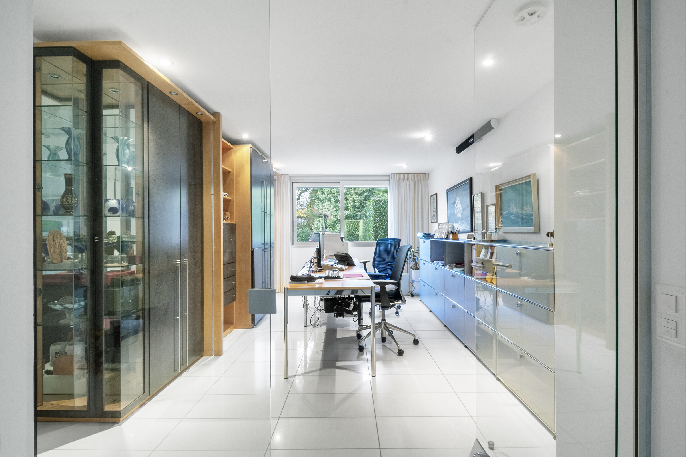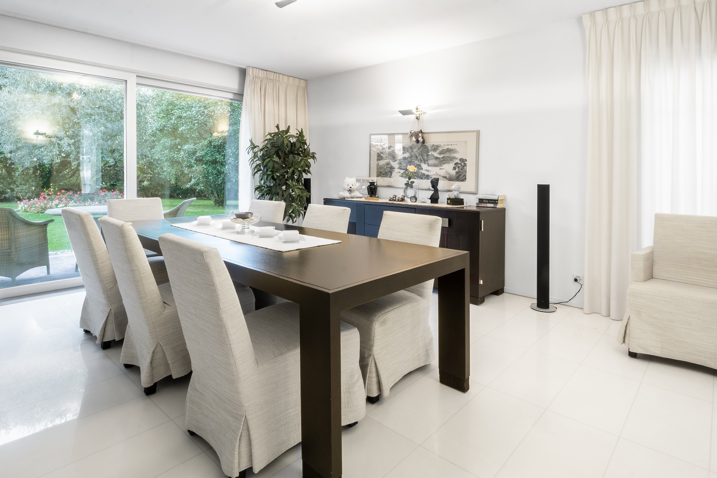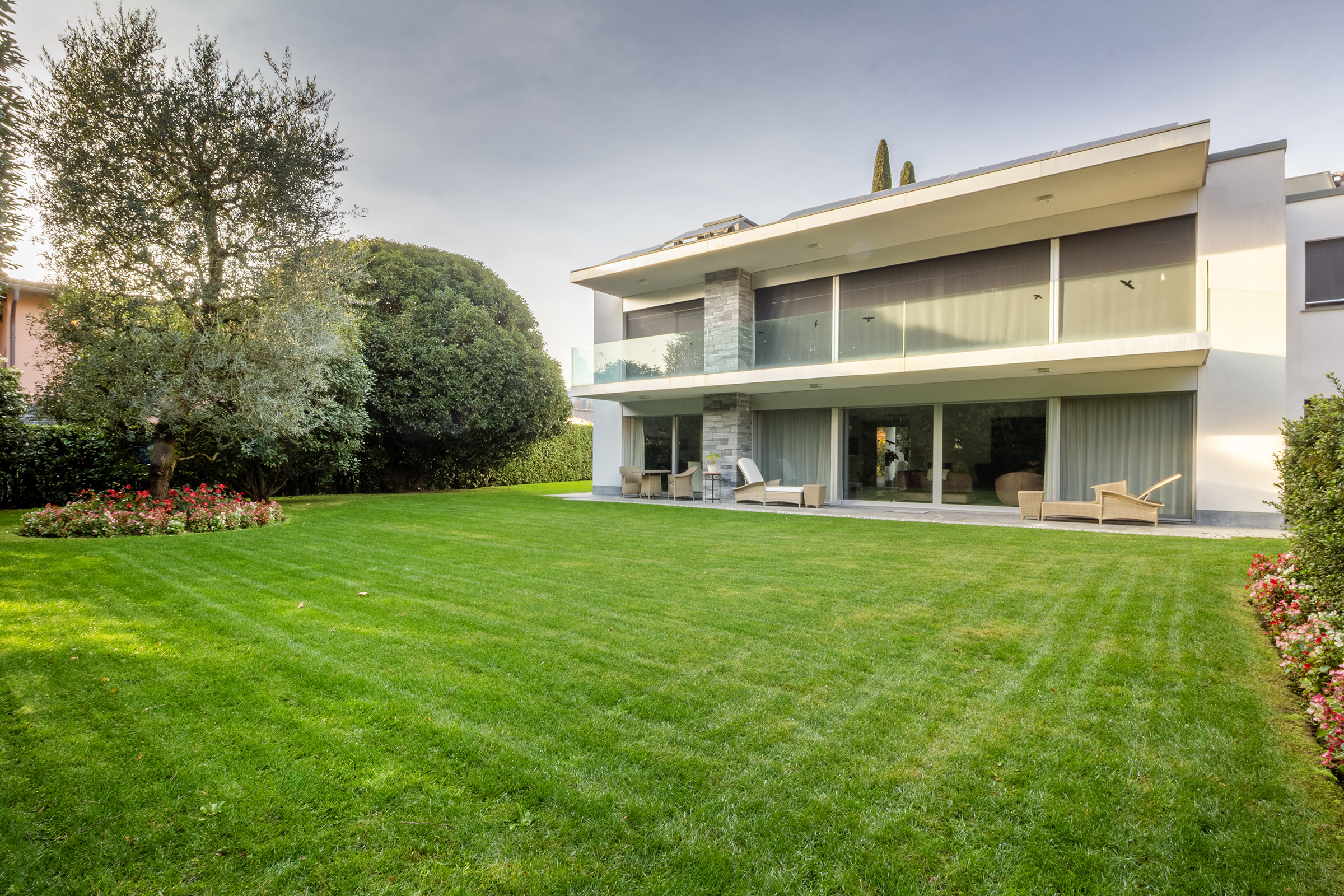 Tutti gli ambienti interni si distinguono per luminosità e ampiezza. Al piano terreno si sviluppa la zona living, con accesso diretto alla terrazza e al magnifico giardino, dove vi accoglie una grande piscina circondata da angoli ombreggiati sotto alberi da frutto, ideali per momenti di relax. Sullo stesso livello trovano spazio la sala da pranzo, la cucina, una camera con bagno, guardaroba, WC ospiti, studio, sala lettura, sauna con solarium, zona riposo e bagno dedicato. La cucina esterna, collegata alla terrazza, è perfetta per barbecue e convivialità. Al piano superiore, la zona notte ospita una suite padronale con ampia cabina armadio, bagno con whirlpool e terrazza panoramica, oltre a due ulteriori camere da letto con guardaroba, bagno e terrazzo. Completano la proprietà una cantina vini, locale tecnico, lavanderia, ascensore interno che collega i tre piani, garage doppio predisposto per ricarica elettrica e un ampio piazzale con spazio per più auto.
