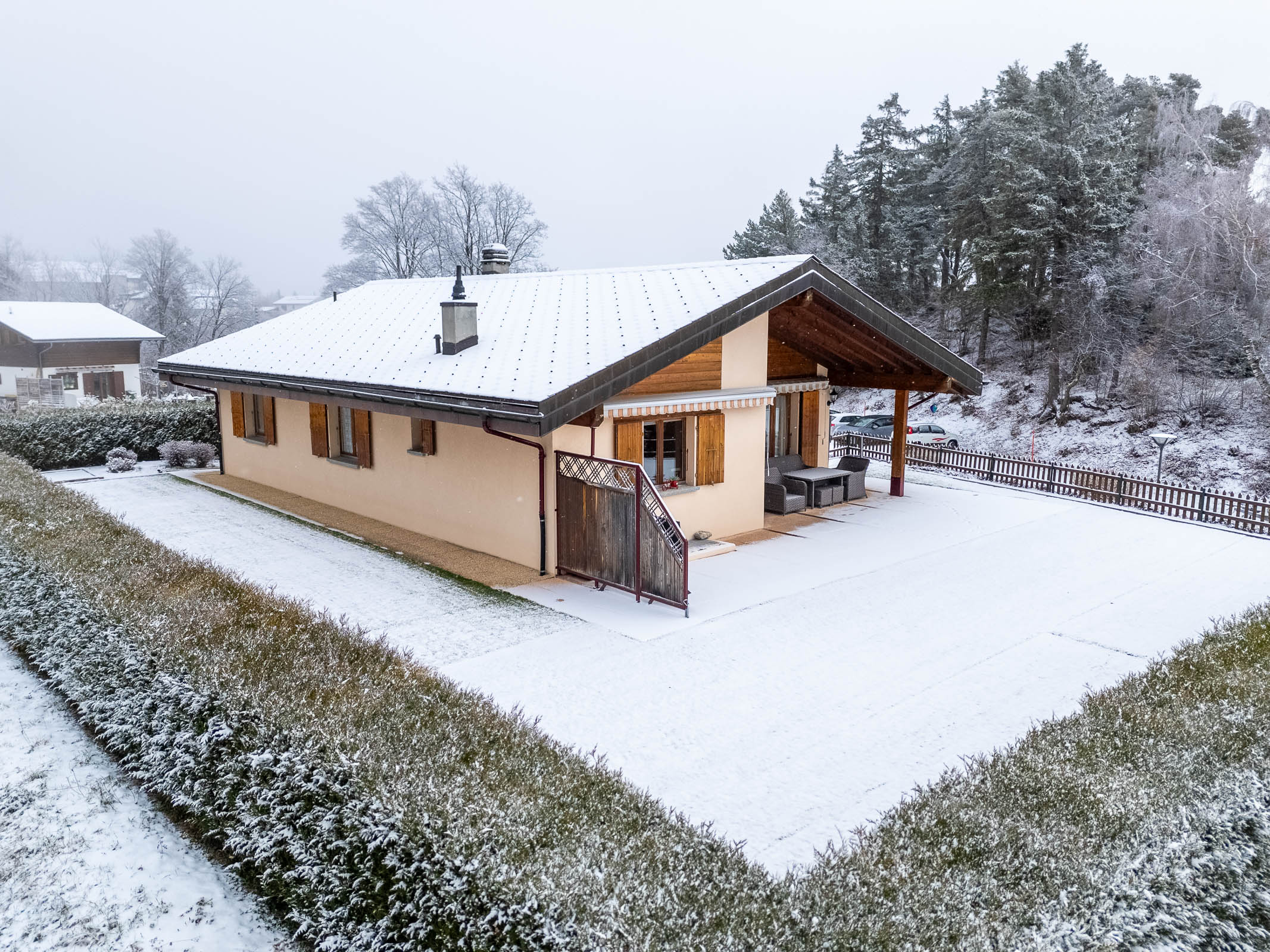 À l’extérieur, une grande terrasse aménagée avec pelouse synthétique vous permettra de profiter pleinement des soirées d’été tout en admirant la vue panoramique sur les montagnes.
