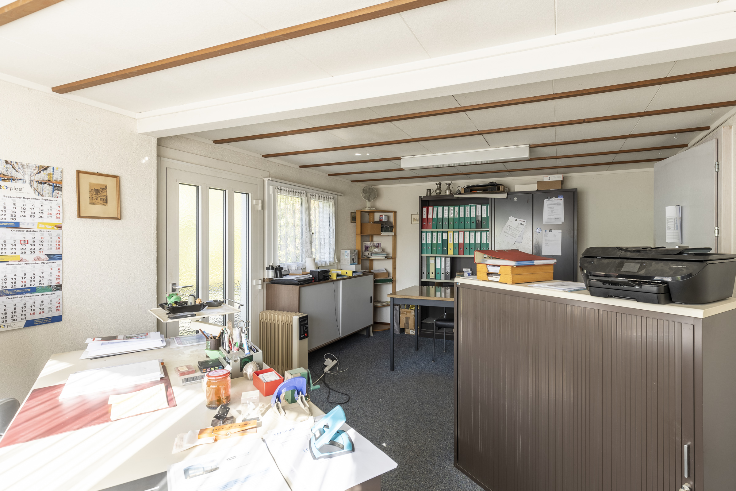 Die Halle verfügt über helle Innenräume mit hoher Deckenhöhe, wodurch sich auch der Einsatz grösserer Maschinen oder Regalsysteme problemlos realisieren lässt. Die Anlieferung erfolgt über eine Rampe auf der Rückseite des Gebäudes, sodass auch schwere Nutzfahrzeuge bequem bedient werden können. Direkt angrenzend befinden sich Büro- und Sozialräume, die effiziente Arbeitsabläufe ermöglichen.