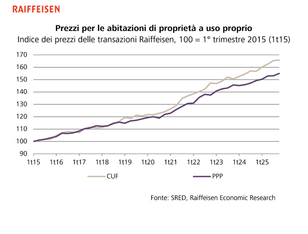 Secondo Fredy Hasenmaile, capo economista di Raiffeisen Svizzera, la domanda interna rimane uno dei principali motori della crescita. A ciò si aggiunge la scarsità strutturale dell’offerta, che continua a sostenere il mercato.